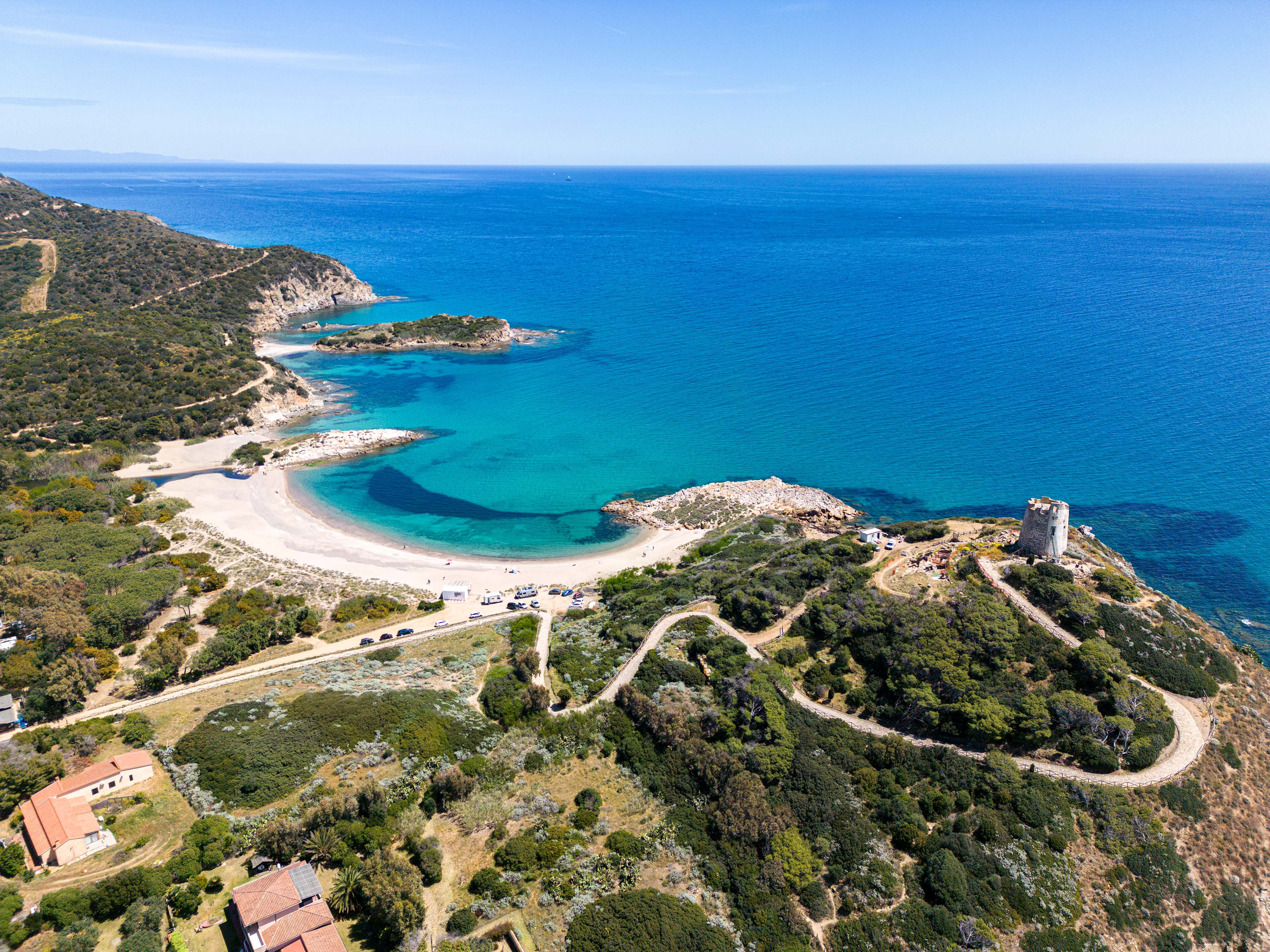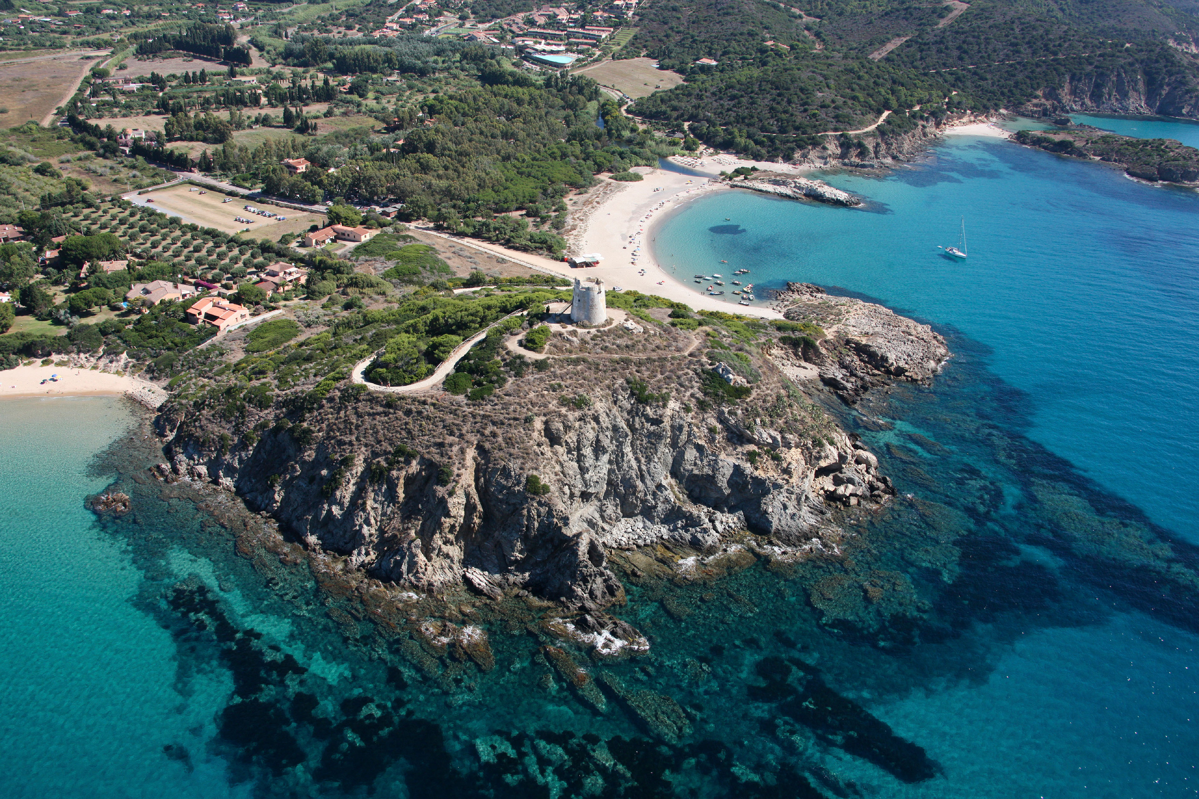 I resti dell’acropoli di Bithia sorgono sulla sommità di un promontorio collocato tra la spiaggia di Su Portu a N-E e quella di Sa Colonia a S-O.