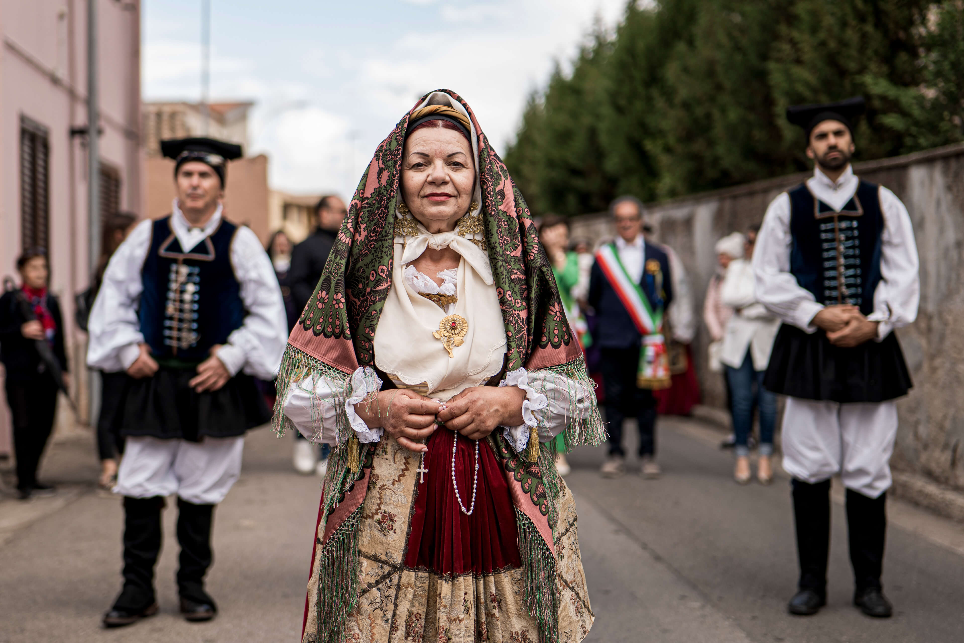 La processione vede la statua portata all’interno di un sontuoso cocchio in stile barocco, su un carro trainato da buoi. I carri tradizionali, chiamati in Lingua sarda “traccas”, sono riccamente decorati con festoni e i buoi che li trainano, portano dei gioghi ricamati con corna abbellite da stoffe multicolori. I fedeli al seguito sono vestiti con l’abito tradizionale del proprio paese. Tutto il percorso è arricchito dalle melodie delle launeddas.