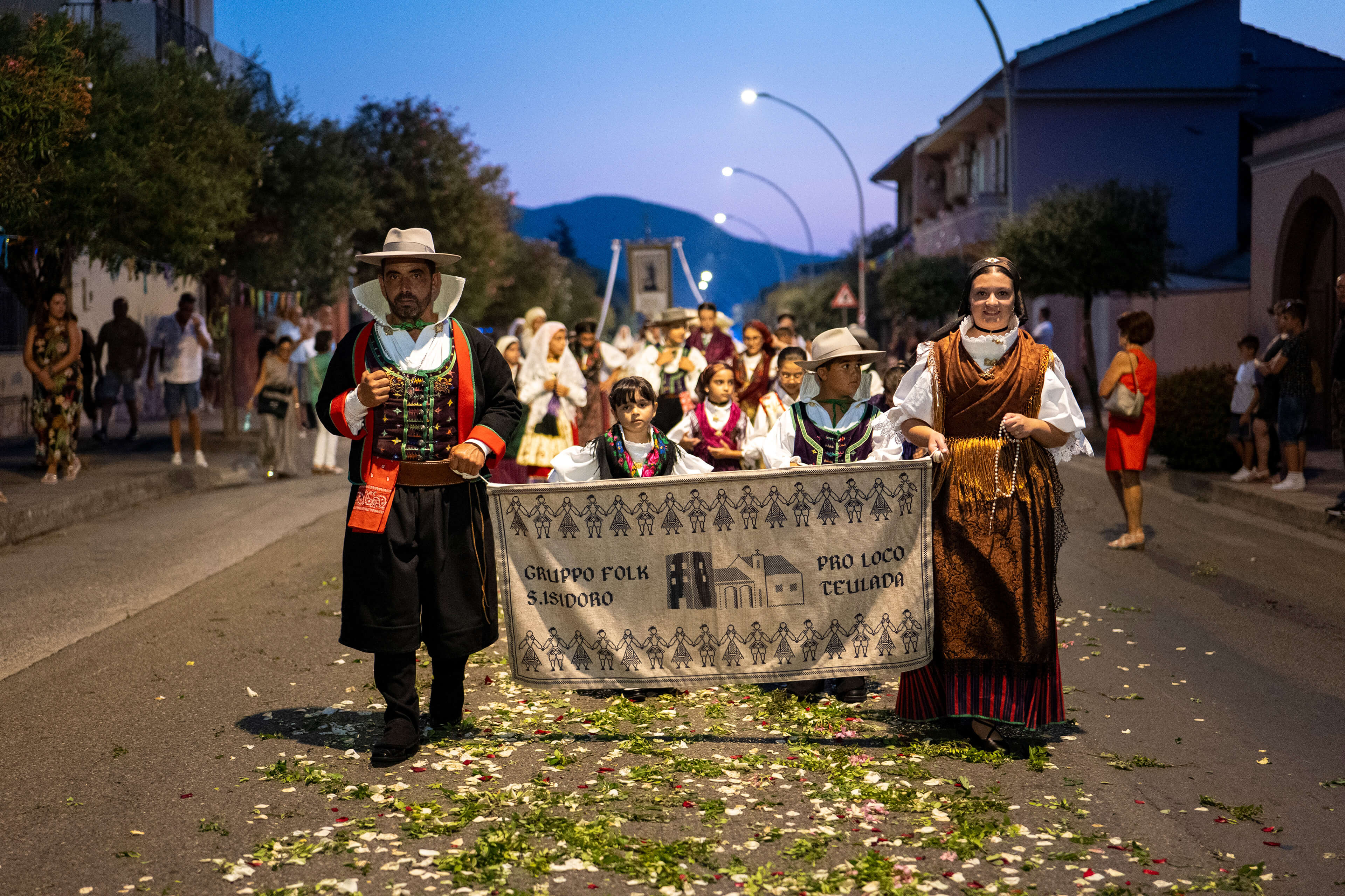 A Teulada la prima festa di Sant'Isidoro viene celebrata il 15 maggio, con una processione religiosa che vede portare la sua statua, dalla chiesa parrocchiale a quella campestre a lui dedicata. Il simulacro viene issato su un cocchio trainato da buoi, addobbato con fiori e spighe di grano, e viene accompagnato da gruppi in abito tradizionale teuladino da fedeli a piedi e a cavallo, provenienti da diversi comuni dell’isola.